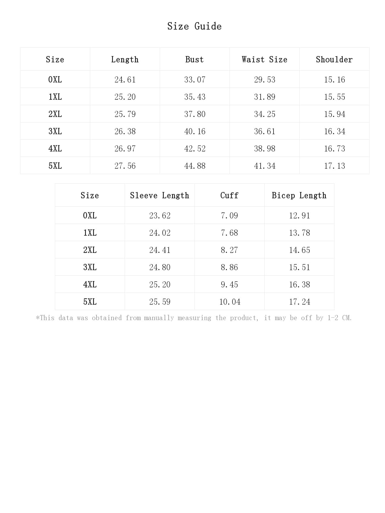 3XL:Bicep Length:15.7IN,Bust:41.3IN,Cuff:8.9IN,Length:26.4IN,Shoulder:15.9IN,Sleeve Length:24.8IN,Waist Size:37.4IN
